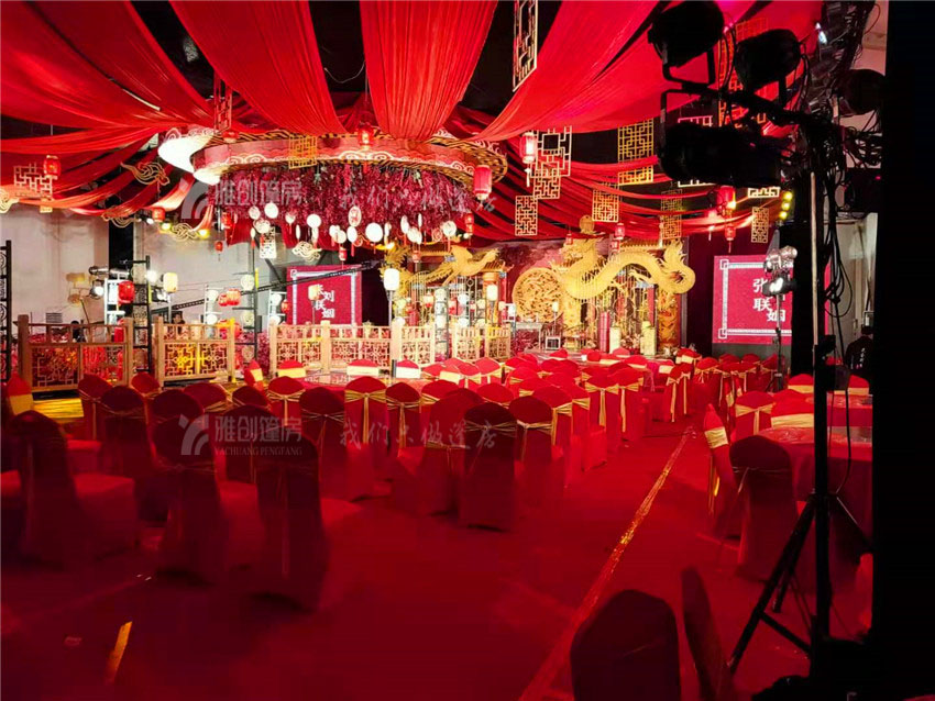 红色色调为主,搭建出中式婚庆,红红火火的婚庆篷房,一下使气氛渲染起来,整个场合显得既高端又喜庆。